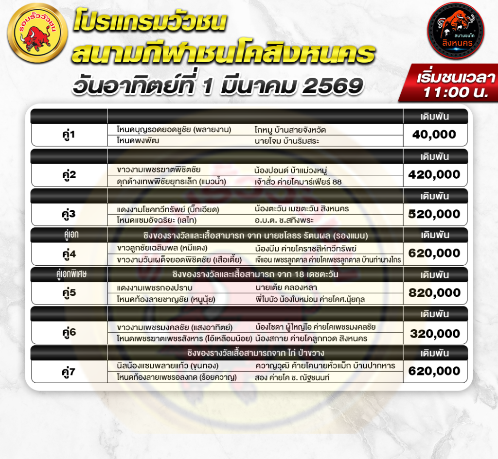 สนามกีฬาชนโค สิงหนคร วันที่ 1 มีนาคม 2569