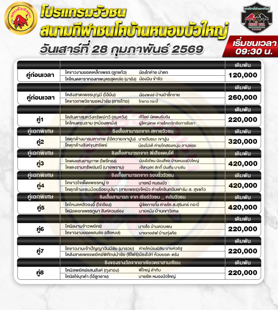 สนามกีฬาชนโค หนองบัวใหญ่ วันที่ 28 กุมภาพันธ์ 2569