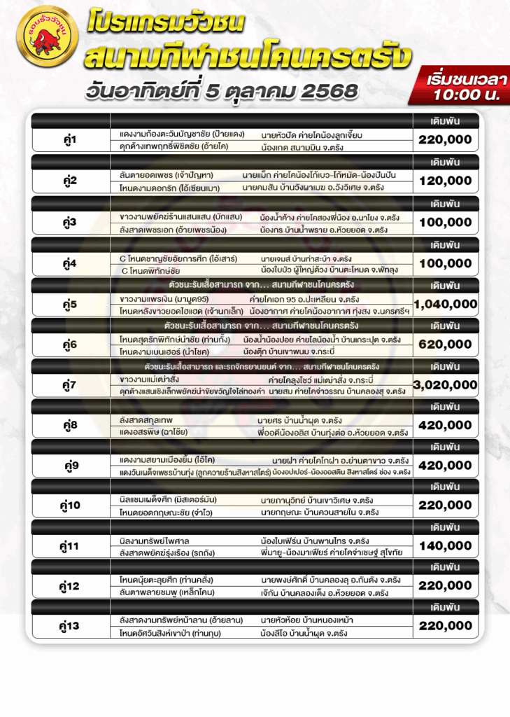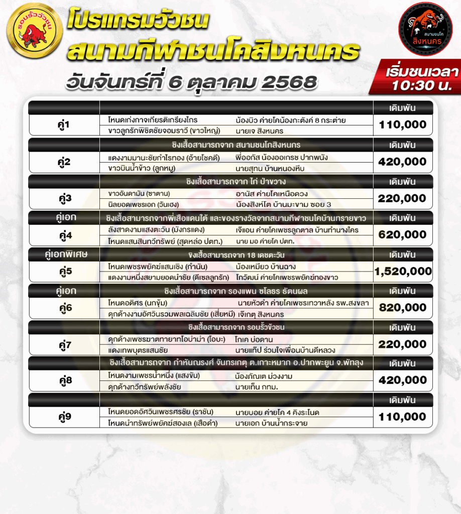สนามกีฬาชนโค สิงหนคร วันที่ 6 ตุลาคม 2568