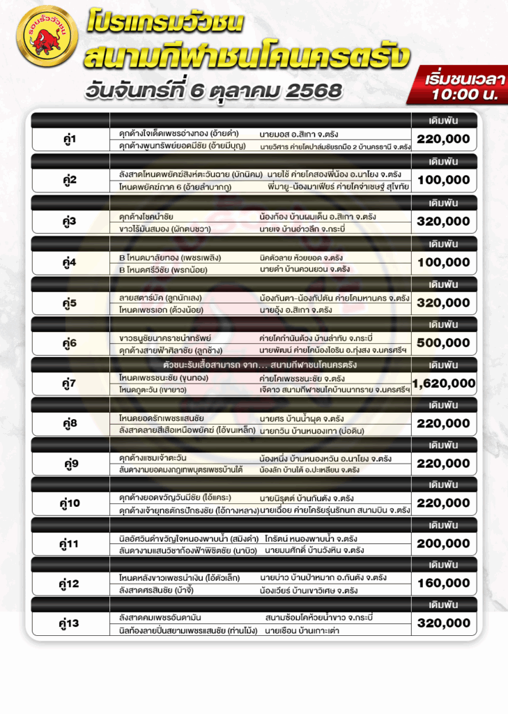 สนามกีฬาชนโค นครตรัง วันที่ 6 ตุลาคม 2568