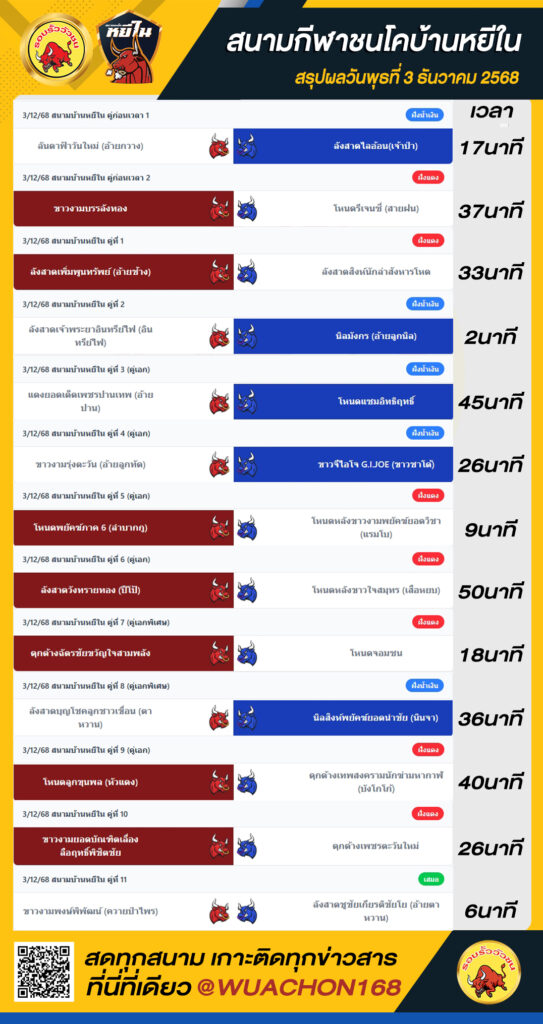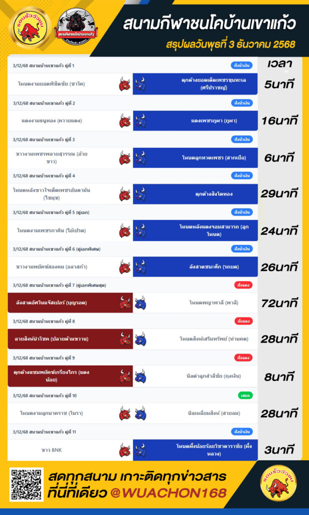 สรุปผลวัว เขาแก้ว วันที่ 3 ธันวาคม 2568